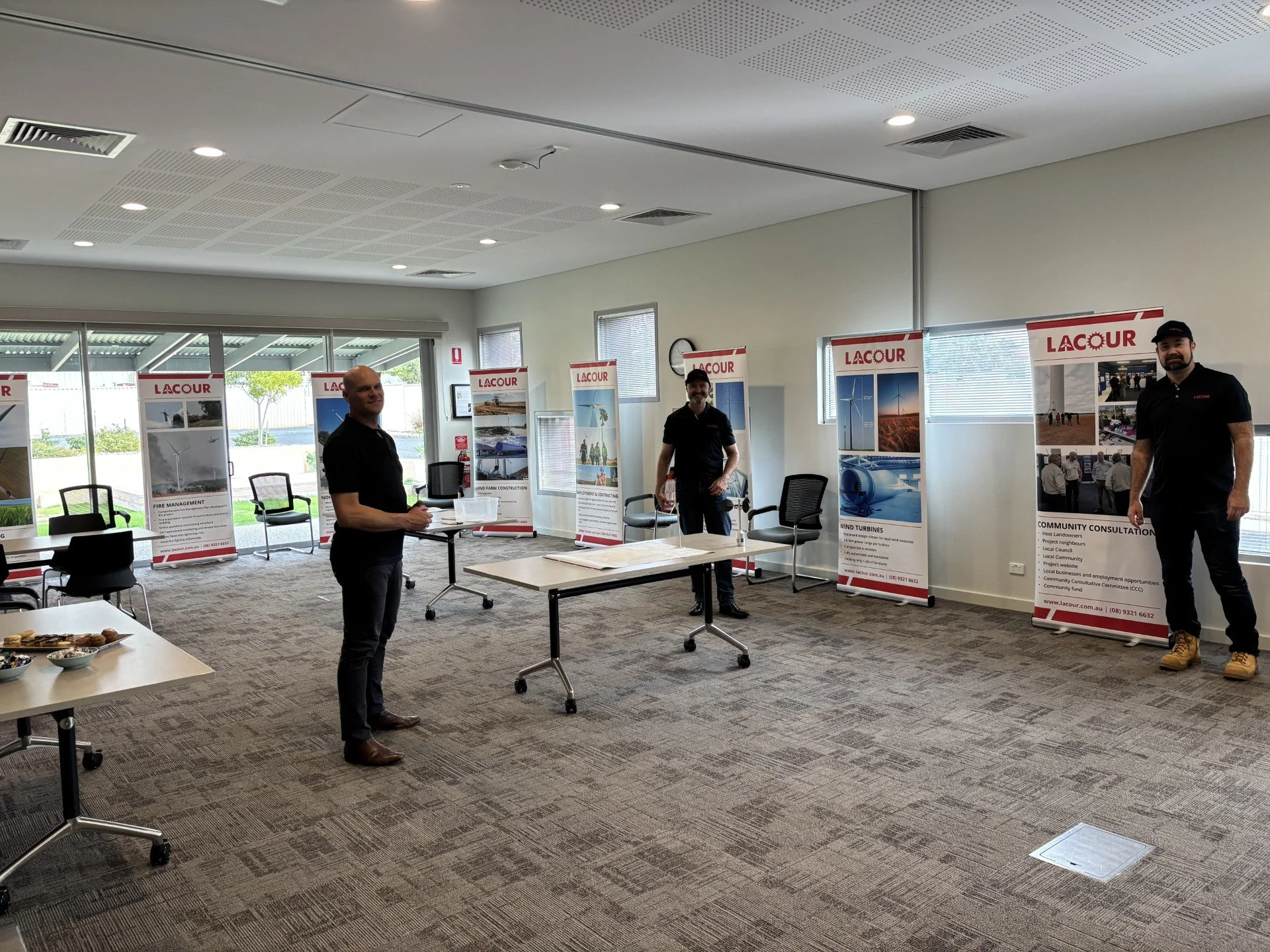 The Lacour Energy team has been in the community for a while, presenting at the Darkan Wind Energy forums in mid 2023 and late 2024. As the project progresses, more frequent and detailed engagement on the specific project will take place to ensure community awareness and involvement.